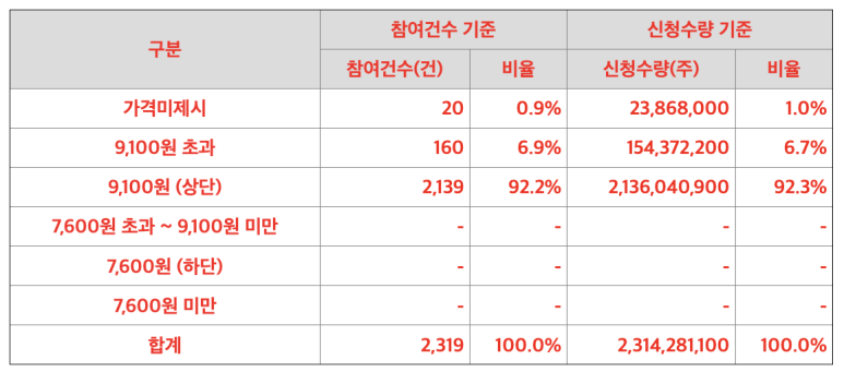 | 공모가 | 9,100원 (공모희망밴드 7,600~9,100원 상단 확정 / 밴드 상단 이상 100% 배분) |