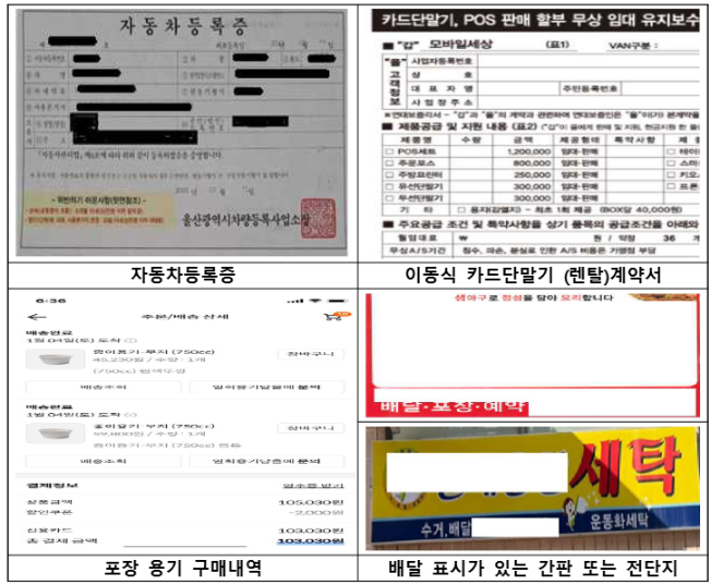- 직접 배달 인프라 증빙 (차량 등록증, 카드 단말기 계약서, 포장 용기 구매 내역 등)
