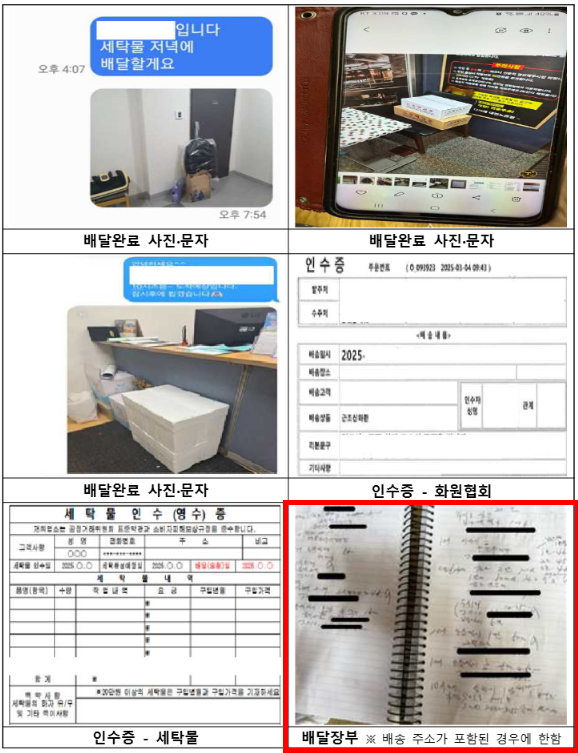 - 배달 실적 증빙 (배달 완료 문자, 인수증, 배달 장부 등)