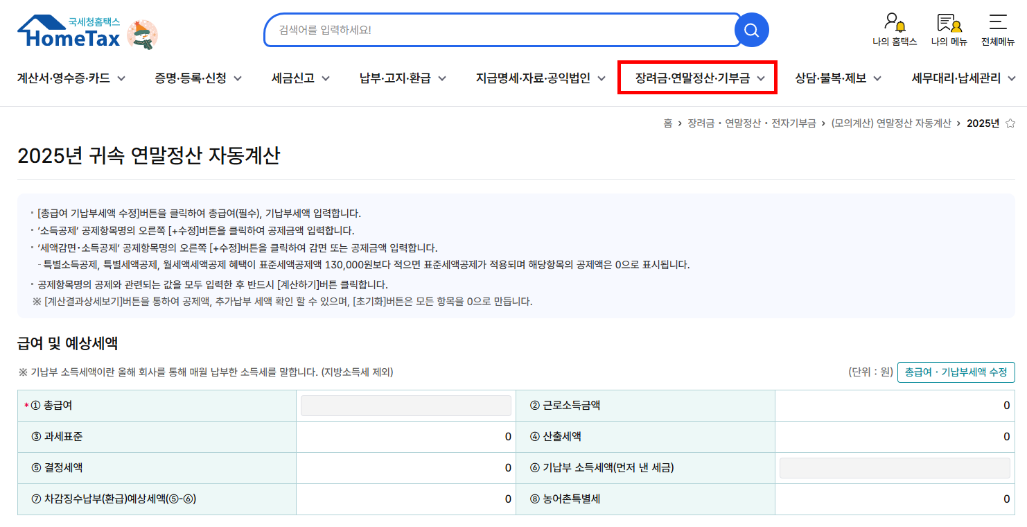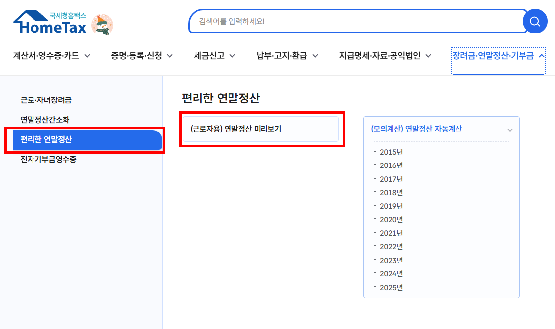 - 메뉴에서 장려금 · 연말정산 · 기부금 → 편리한 연말정산 → (근로자용) 연말정산 미리보기 선택