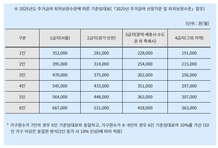 | 가구 수 | 생계급여 (30%) | 의료급여 (40%) | 주거급여 (47%) | 교육급여 (50%) |