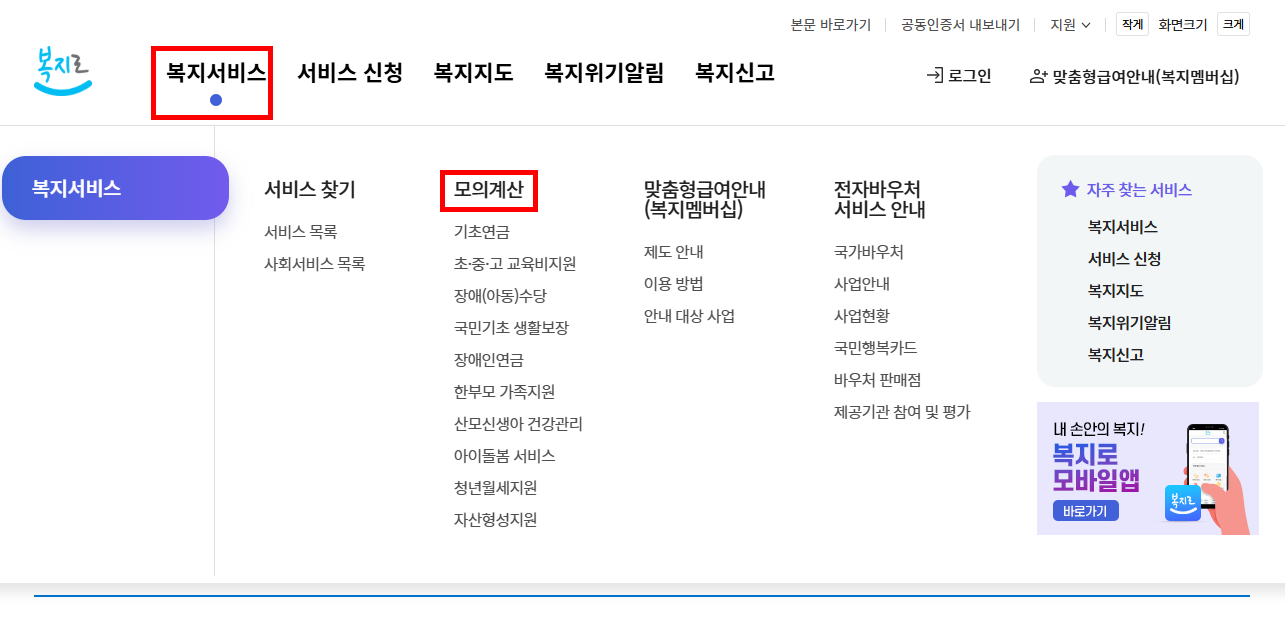 1️⃣ 복지로 홈페이지 → [모의계산] 클릭