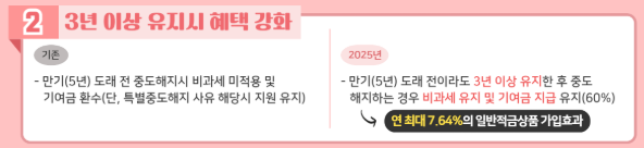 - 2년 이상 유지 시 원금의 최대 40% 부분 인출 허용 (2025년 하반기 시행 예정)