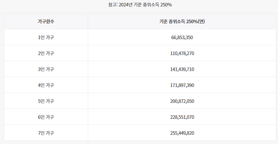 - 가구 소득: 중위소득 250% 이하 (주민등록등본 기준, 가구원 합산)
