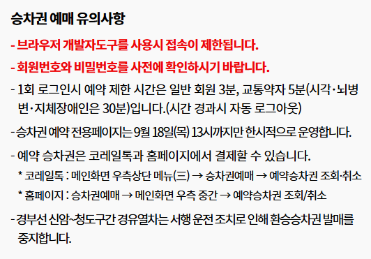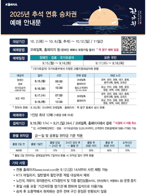 참고: 2025년 코레일 예매는 당초 9/1~9/4 계획이었으나 선로 안정화 조치 등으로 9/15~9/18로 2주 연기되었습니다.