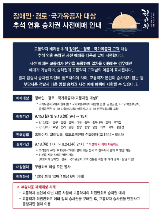 대상: 만 65세 이상, 등록 장애인, 국가유공자(동반 1인 가능). 전화접수 전용 1544-8545도 운영. - 일반예매(전 국민): 9/17(수)~9/18(목) 07:00–13:00, 노선 분할 운영
