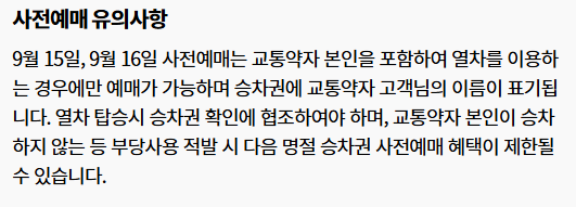 - 잔여석: 9/11 15:00부터 앱·홈페이지·역창구에서 상시 구매 가능. 결제 시작 9/11 17:00, 마감(일반 ~9/14, 사전 ~9/17).